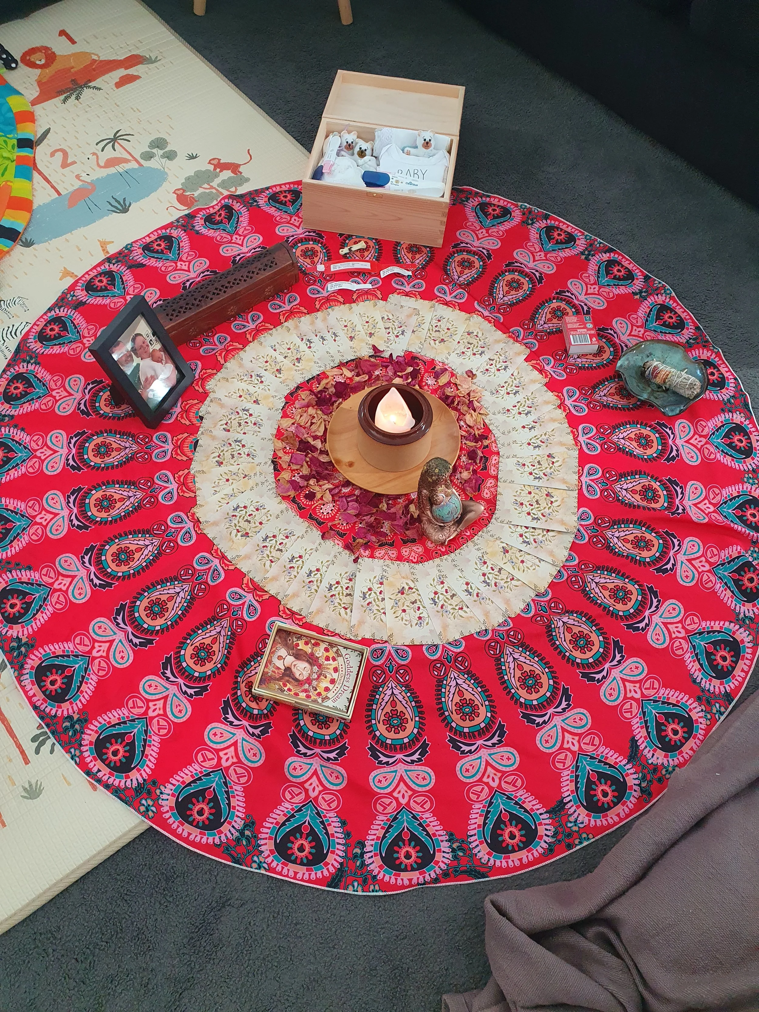 I invite you to create a little altar, before we begin. Where you can gather any special items that mean something to you and your partner, it may be photos, mementos from pregnancies, births, losses. Anything you wish to include is welcome. For example: memory boxes, candles, photos, toys, incense, poetry.